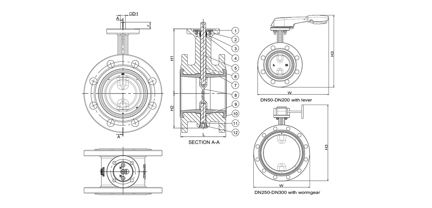 | DN | L | L1 | D | D1 | D3 | D4 | H1 | H2 | H3 | b | Z-ød | |||