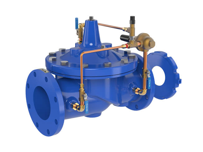 Rate of Flow Control Valves prevent excessive flow by limiting flow to a preselected maximum rate, regardless of changing line pressure. They are hydraulically operated, pilot controlled, diaphragm valves. The pilot control responds to the differential pressure produced across an orifice plate installed downstream of the valve. Accurate control is assured as very small changes in the controlling differential pressure produce immediate corrective action of the main valve. Flow rate adjustments are made by turning an adjusting screw on the pilot control.